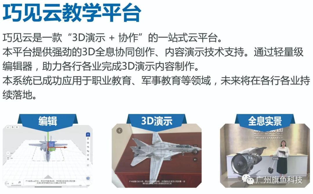 比起往年參會(huì),本次旗魚帶來(lái)了全新拳頭產(chǎn)品:巧見(jiàn)云教學(xué)平臺(tái)、無(wú)人作戰(zhàn)模擬仿真教學(xué)、MR模擬駕駛訓(xùn)練。
