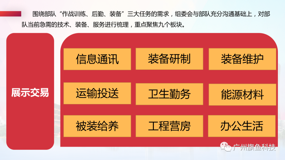 廣州兩用技術(shù)裝備成果交易會(huì)(簡(jiǎn)稱:兩交會(huì))以市場(chǎng)為主導(dǎo),以部隊(duì)需求為牽引,推進(jìn)兩用技術(shù)發(fā)展和應(yīng)用,促進(jìn)兩用技術(shù)產(chǎn)業(yè)的發(fā)展,構(gòu)建一個(gè)由市場(chǎng)主導(dǎo),以需求牽引的兩用技術(shù)交易服務(wù)平臺(tái)。