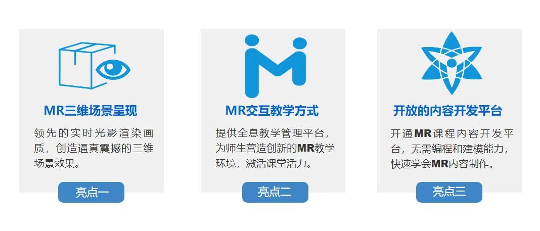 基于自主開發(fā)的MR軟硬件產(chǎn)品,為師生打造高度融合、高度沉浸、高度交互的解決方案,建立基于混合現(xiàn)實(shí)的可視化生態(tài)體系。